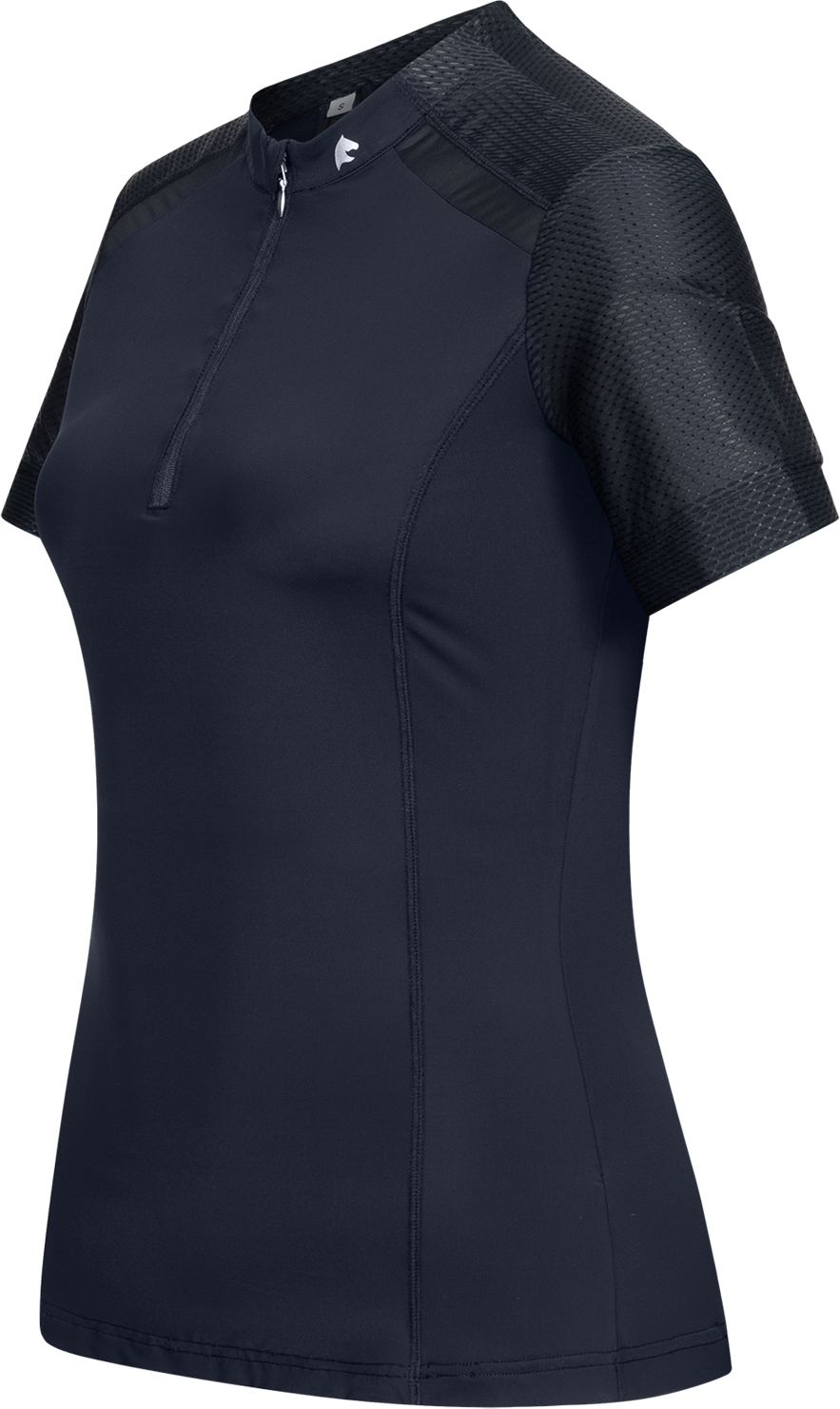 Die Ärmel und Schulterpartien sind aus einem speziellen Mesh-Gewebe mit Wabenstruktur gefertigt, was dem Shirt eine sportlich-moderne Optik verleiht. Dank des praktischen Reißverschlusses am Ausschnitt, der zusätzlich mit einem weichen Kinnschutz ausgestattet ist, kannst du die Belüftung individuell anpassen. Ein dezenter, glitzernder Logo-Print am Kragen rundet das Design stilvoll ab und sorgt für einen Hauch von Eleganz.