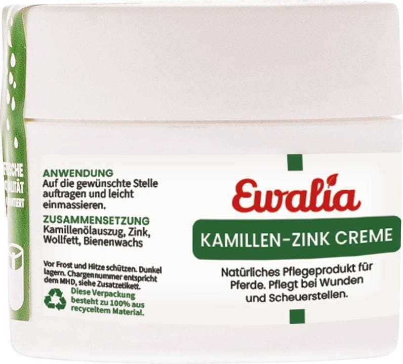 Die EWALIA Kamillen-Zink Creme pflegt bei Wunden und Scheuerstellen. Die Kamille wirkt pflegend und heilend. Zink beruhigt und pflegt die Haut.