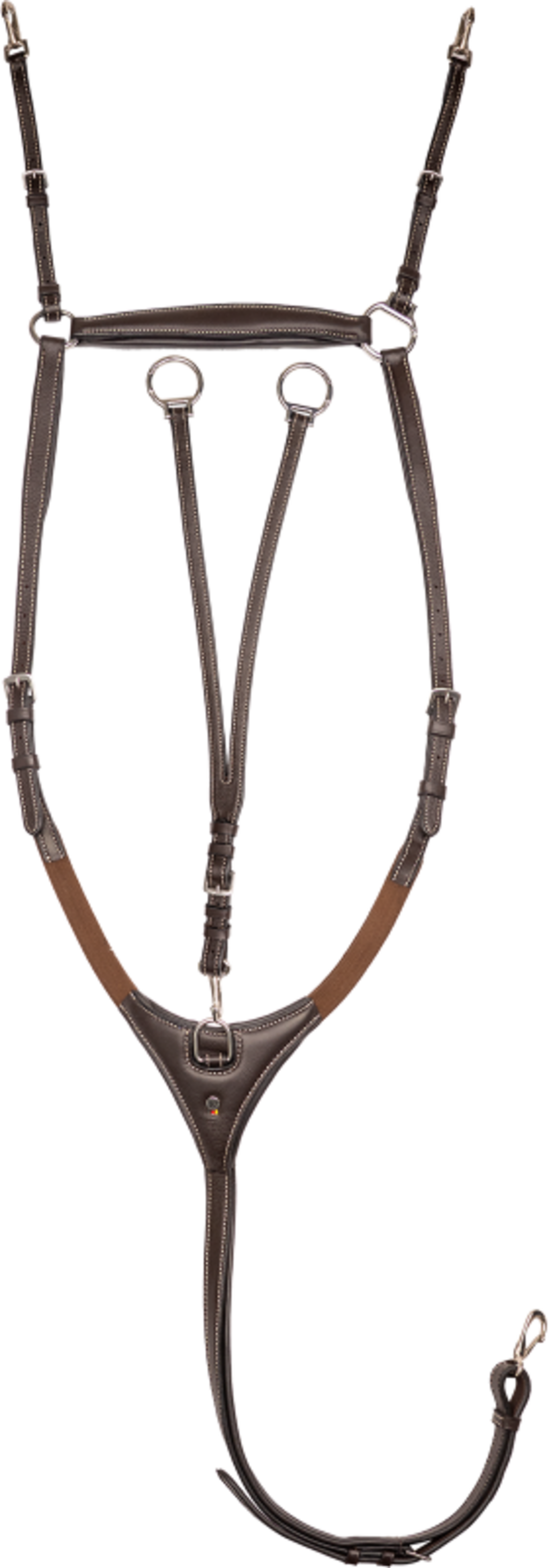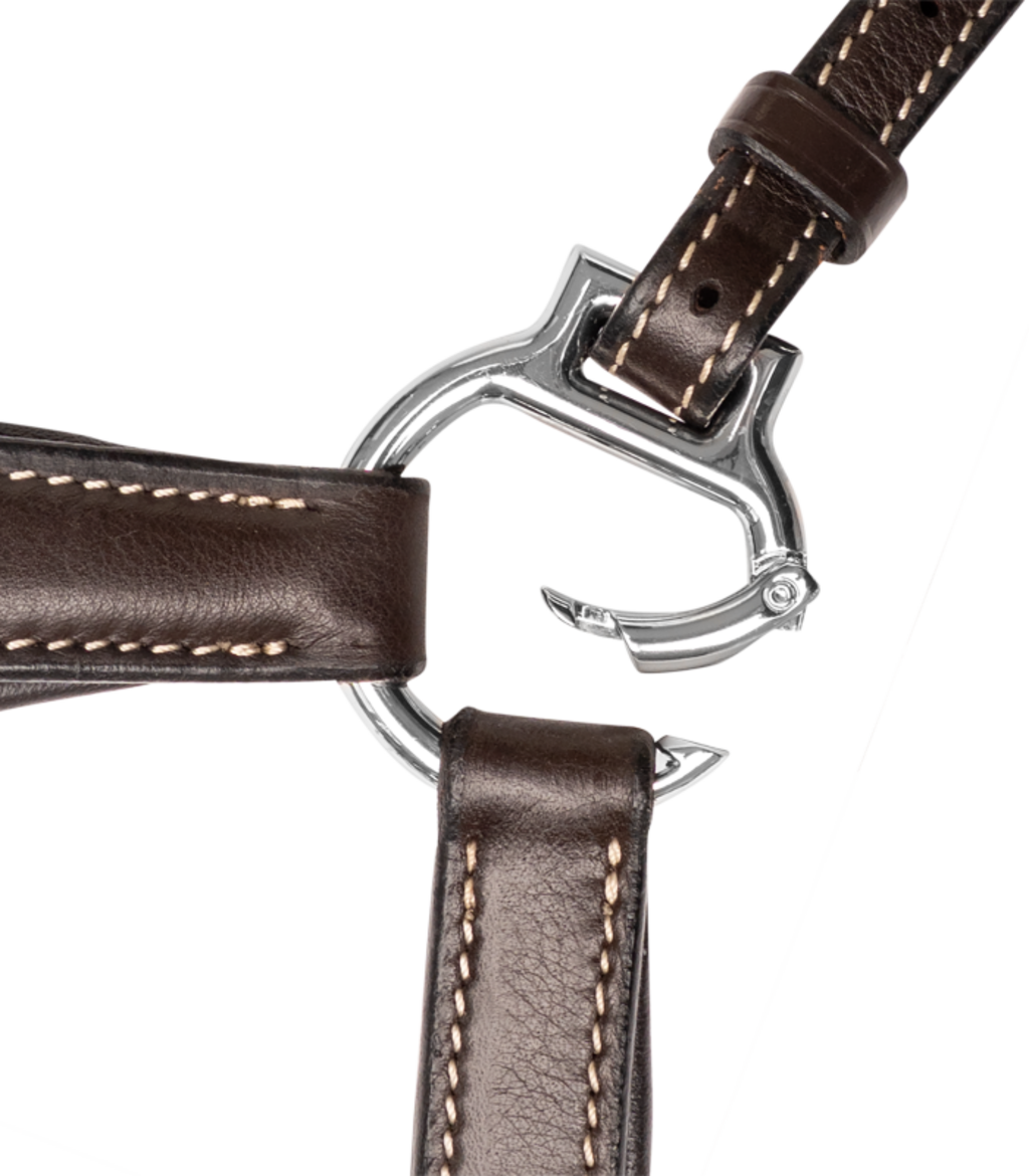 Für eine unkomplizierte Handhabung sorgen die praktischen Karabiner zur schnellen Befestigung an Sattel und Gurt. Durch den Snap-Ring am Widerrist kannst du das Vorderzeug problemlos anlegen, ohne dein Pferd abzubinden. Die verstellbare Martingalgabel ist abnehmbar und dank der Snap-Ringe an den Enden blitzschnell in die Zügel eingeschnallt.