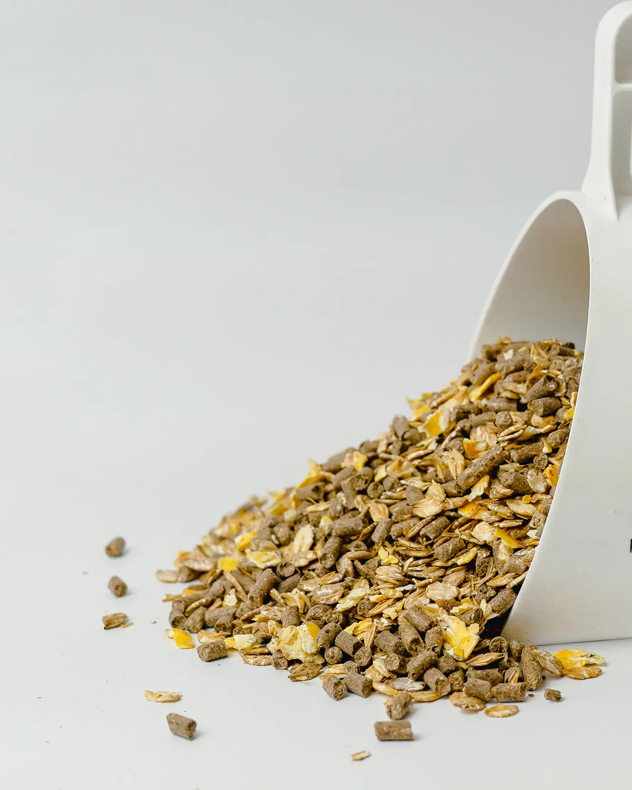 Wheat bran, Corn (Corn flakes), Barley (Barley flakes), Oats, Sugar beet molasses, Linseed cake, Warm-air-dried grass chaff, Lignocellulose, Fodder lime, Brewer's yeast inactivated, Livestock salt, Sodium bicarbonate, Magnesium oxide, Monocalcium phosphate