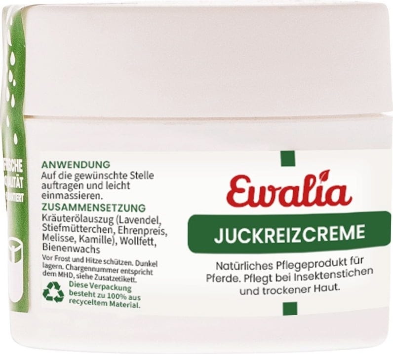Crème anti-démangeaisons EWALIA soigne votre cheval touché par les piqûres d'insectes et sa peau sèche. La crème contient de précieuses huiles végétales pour soigner et régénérer la peau.