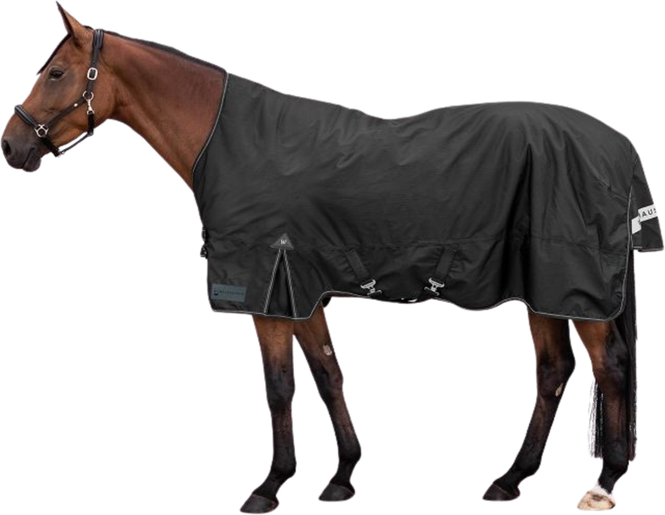 La coupe est pensée dans les moindres détails : les doubles fermetures frontales en T avec recouvrement par bande auto-agrippante, associées aux sursangles croisées réglables, empêchent efficacement tout glissement. Pour la saison sombre, des éléments réfléchissants au niveau du biais et du rabat de queue améliorent la visibilité du cheval.