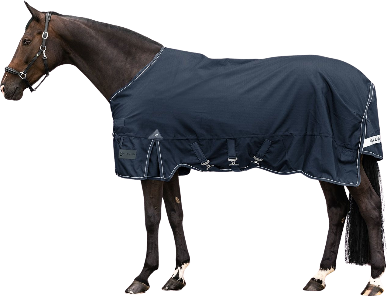 La coupe est soigneusement étudiée : la fermeture frontale pratique en V garantit un maintien stable et, associée aux trois sursangles ventrales, empêche les glissements gênants. Une grande fente d’aisance assure en permanence une liberté de mouvement optimale. Pour encore plus de flexibilité en hiver, la couverture est équipée de boucles de fixation permettant d’ajouter à tout moment un couvre-cou disponible séparément. Elle dispose également d’un rabat de queue extra-large, tandis que le liseré réfléchissant assure une excellente visibilité au crépuscule.