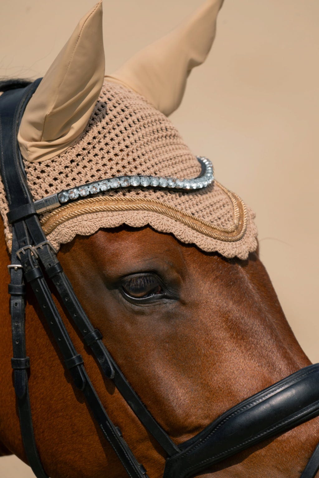Completa l'outfit del tuo cavallo con la cuffietta antimosche Jewel abbinata. Il filato di cotone lavorato all'uncinetto crea un look classico, mentre il materiale softshell elastico garantisce una vestibilità perfetta. L'applicazione Jewel si abbina splendidamente ai sottosella della stessa collezione e protegge efficacemente il tuo cavallo dagli insetti.
